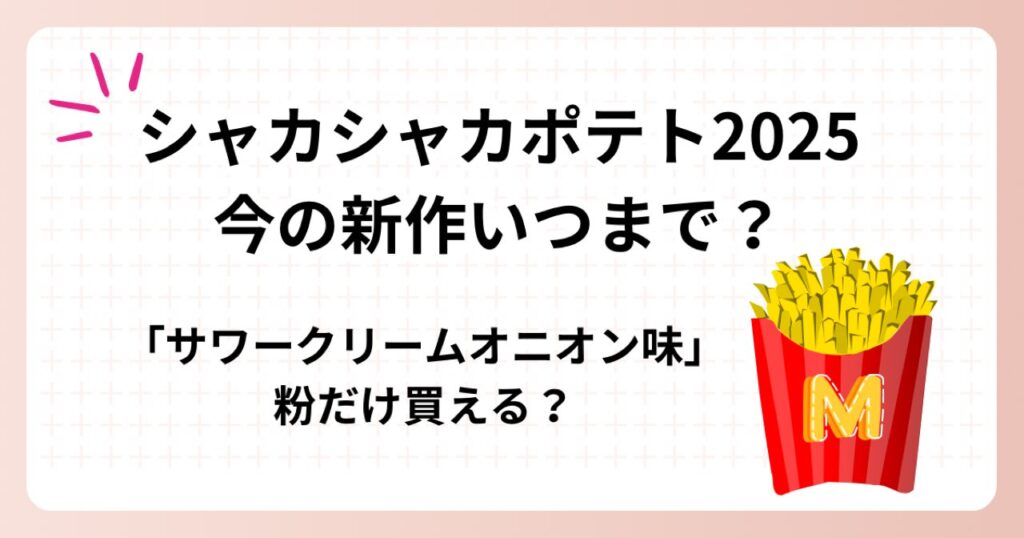 2025年9月最新 マックの人気メニューのシャカシャカポテト。 最新作は「サワークリームオニオン味」です! こちらの記事では、マックシャカシャカポテト2025今の新作はいつまで発売されるのか、現在発売中の商品詳細や、粉だけ買えるのかどうか?などまと... -