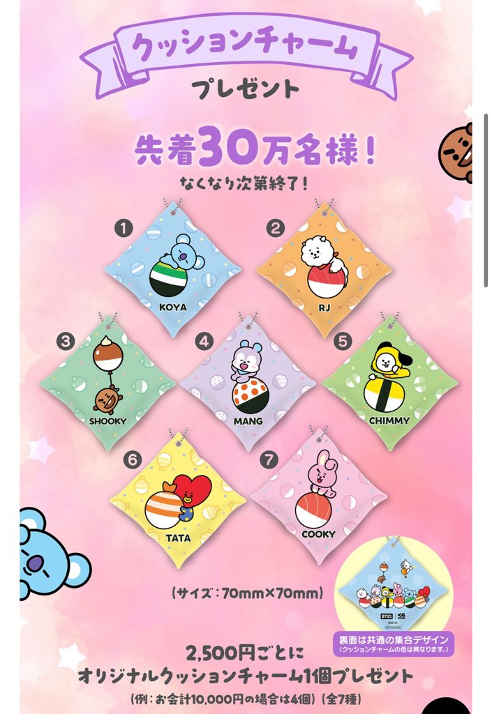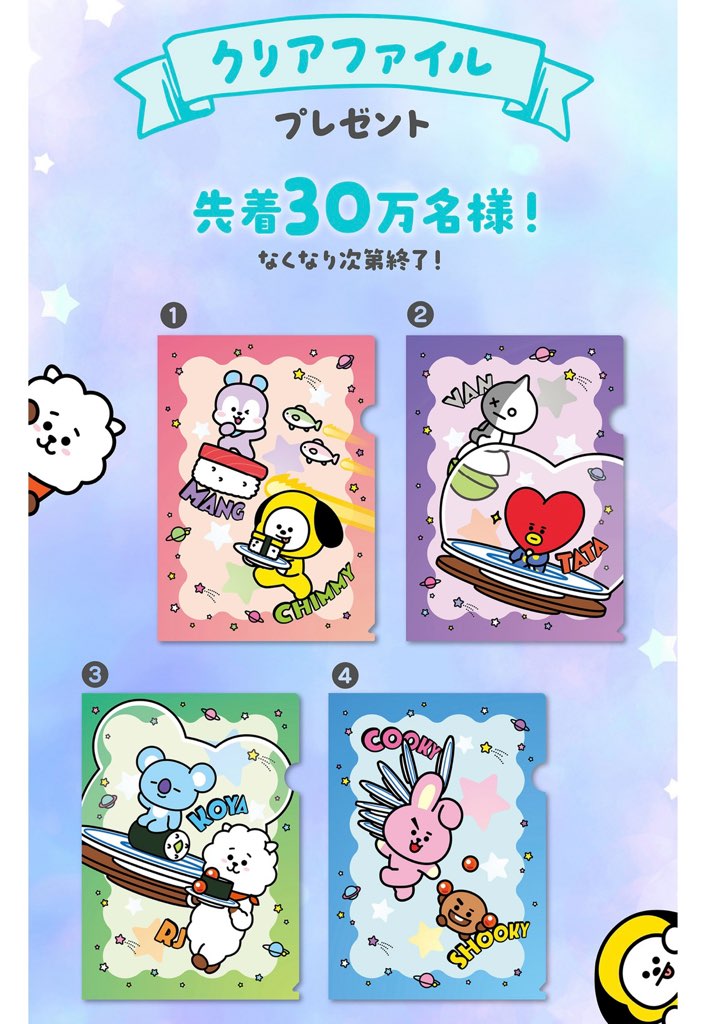 今回開催される「くら寿司BT21コラボ」の先着プレゼントキャンペーンでは、お会計2,500円ごとにクリアファイルやクッションチャームが貰えます。