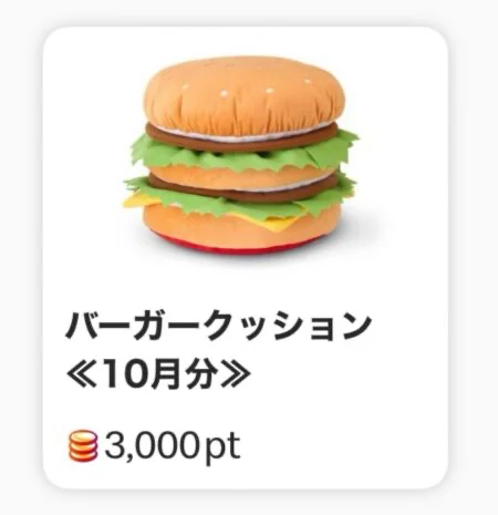 現在、マクドナルドリワードでポイント交換可能なオリジナルグッズは「バーガークッション」のみです。