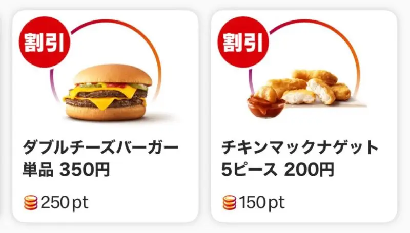 例えばダブルチーズバーガーの場合、「単品350円で買える権利を250ptで買える」という事です。しかも利用は1回限りで1個まで。(お得とは・・??)