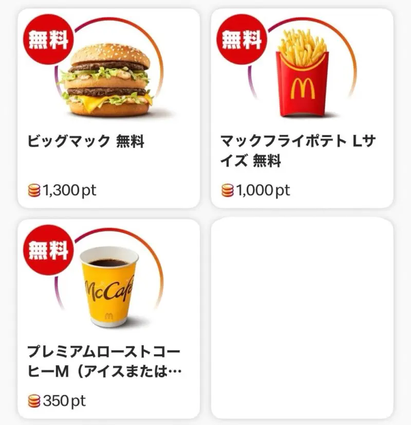 現在、マクドナルドリワードでポイント交換可能な無料引換クーポンはこちらです。