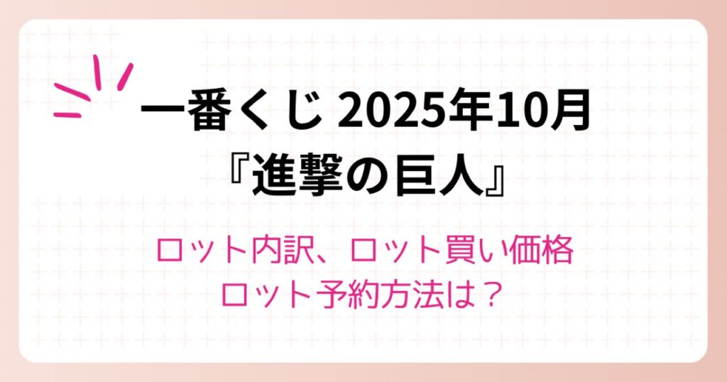 2025年10月24日(金)より発売予定の『一番くじ 僕のヒーローアカデミア -幸せの上に-』 人気のシリーズ「ヒロアカ」の一番くじがまたまた登場♪ 人気タイトルは即日完売になる場合あり!いちはやく情報をチェックしてね。 当記事で分かること ヒロアカ10月の... 一番くじ2025年10月一番くじ「進撃の巨人」ロット内訳・ロット買い値段いくら・ロット予約方法