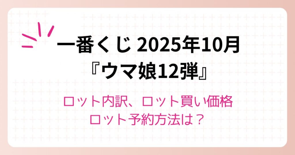 2025年10月10日(金)より発売予定の『一番くじ ウマ娘 プリティーダービー 12弾』 人気のシリーズがまたまた登場♪ 人気タイトルは即日完売になる場合あり!いちはやく情報をチェックしてね。 当記事で分かること ウマ娘12弾一番くじどこで売ってるのか(取扱...