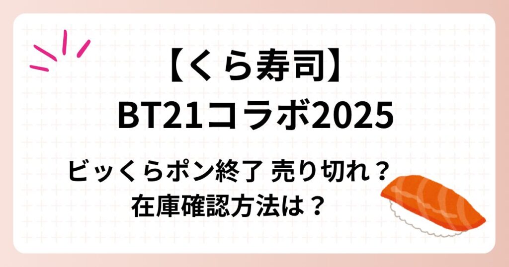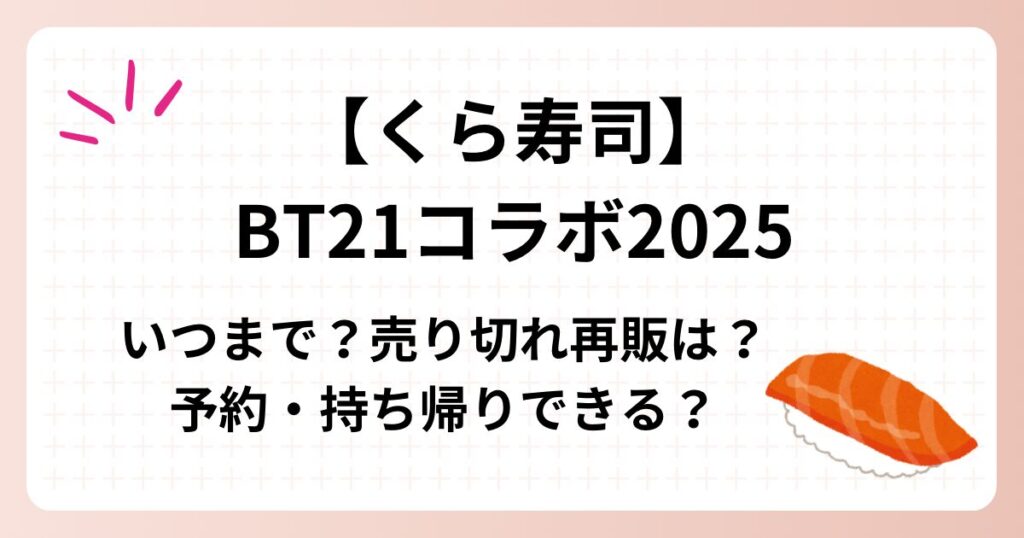くら寿司×BT21コラボが2025年10月3日(金)〜スタート! 先着プレゼント、ビッくらポン、コラボメニューなどは在庫が無くなり次第終了です。 おそらく販売期間中に早期終了となる可能性が高いかと。 こちらの記事では、以下についてまとめました。 くら寿司×... くら寿司くら寿司BT21コラボ2025いつまで?終了、完売、売り切れ再販ある?予約・持ち帰りできる?